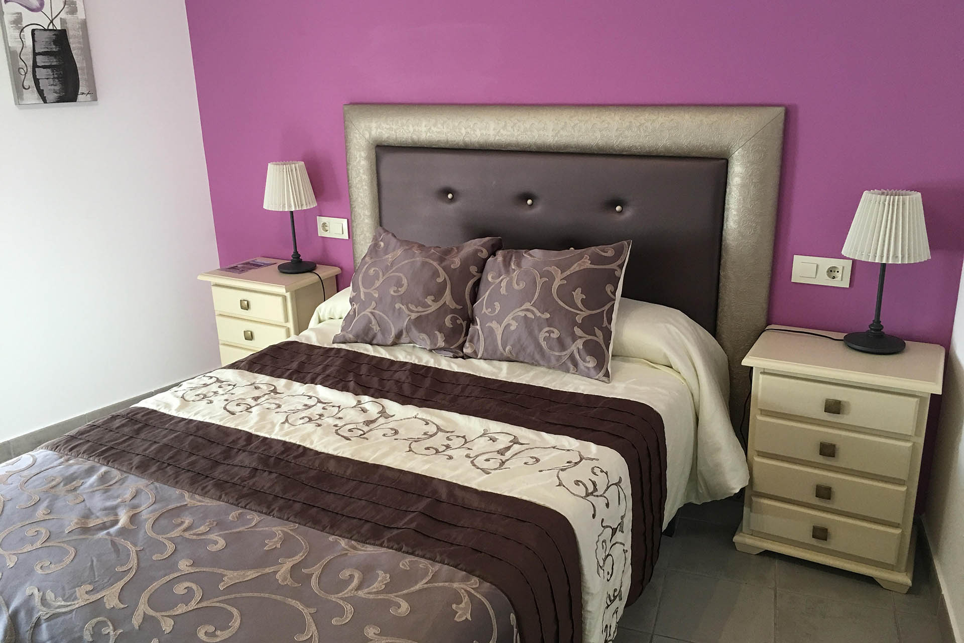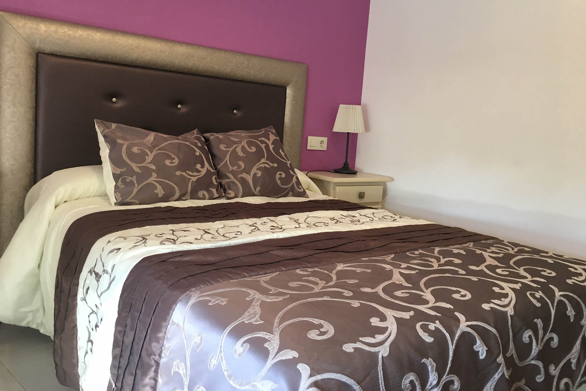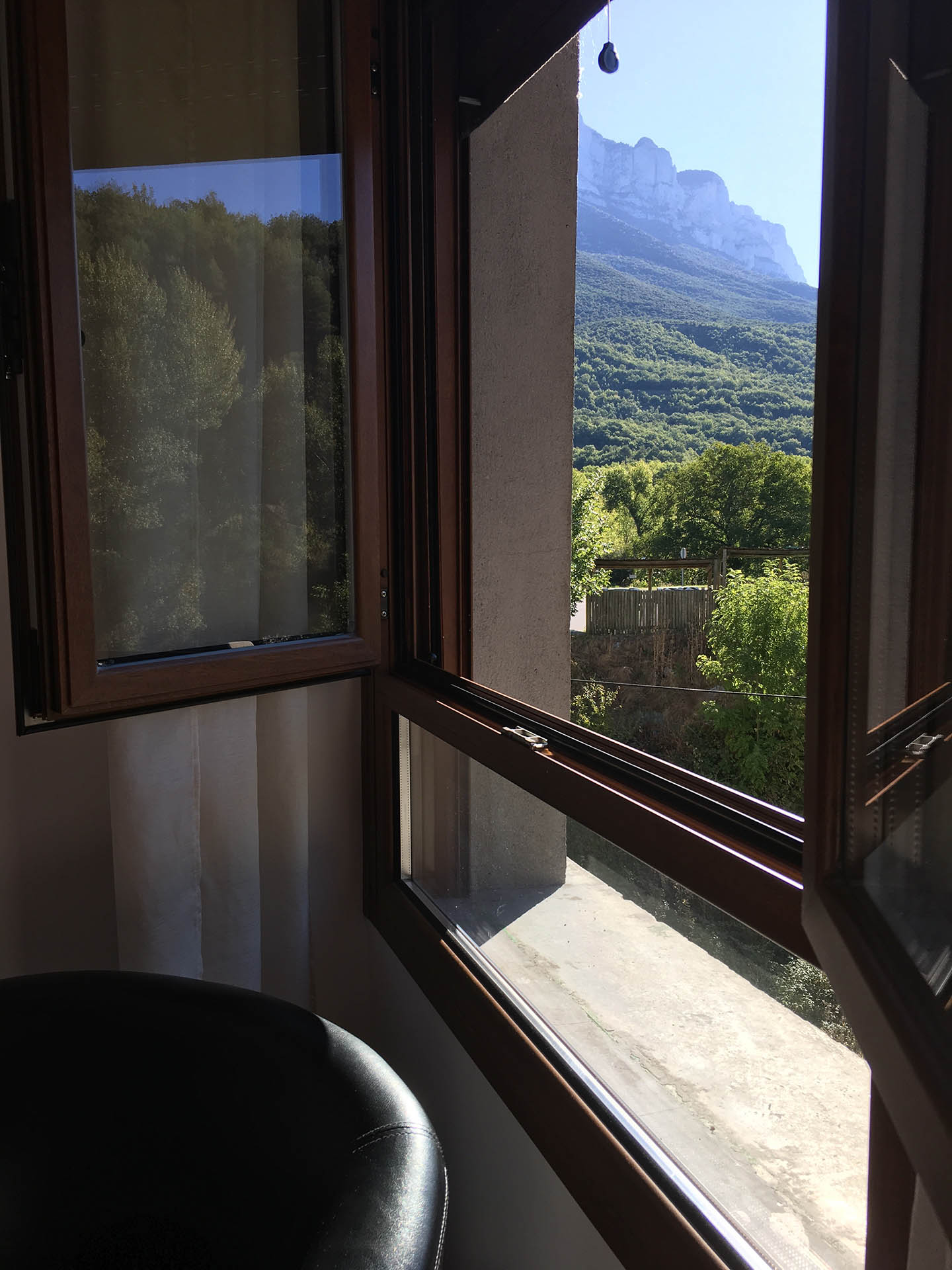 Habitación doble exterior con cama de matrimonio, calefacción, TV y Wifi. Cuarto de baño con ducha. Tiene un pequeño balcón con vistas al rio y a la Peña Montañesa.